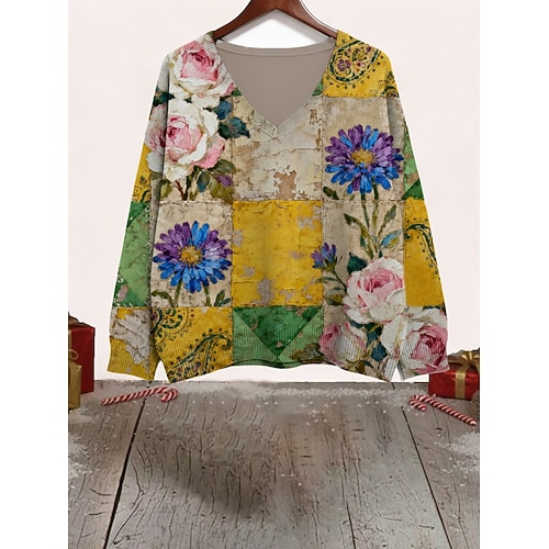 Per donna Felpa Maglione Vintage Moda Streetwear Floreale A Coste Scollo a V Oversize Lavorato a maglia Stampato Manica Lunga Top Regolari Maglia All'aperto Quotidiano Giallo Primavera Autunno
