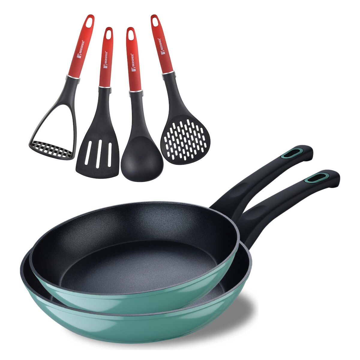 BERGNER - Set mit 2 Bratpfannen Ø20-Ø26 cm Classique aus geschmiedetem Aluminium mit Antihaftbeschichtung und roten Küchenutensilien