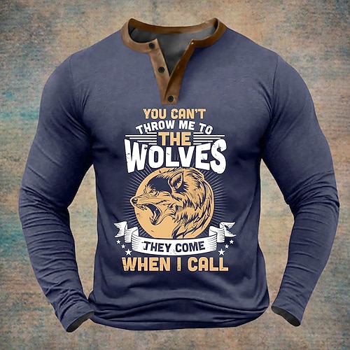 Maglietta Henley a maniche lunghe da uomo maglietta grafica con lupo e la citazione 'Non puoi lanciarmi ai lupi viene quando chiamo' stile di vita