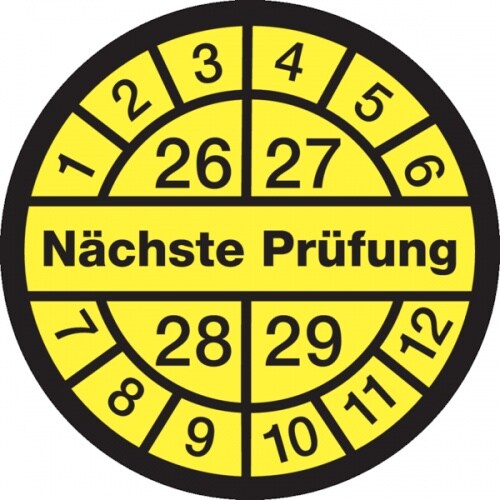 König Werbeanlagen Prüfplakette ab 26, Nächste Prüfung, schwarz/gelb, Folie, Ø 12,5/30 mm - Bogen = 10 Plaketten - 13 mm Folie selbstklebend