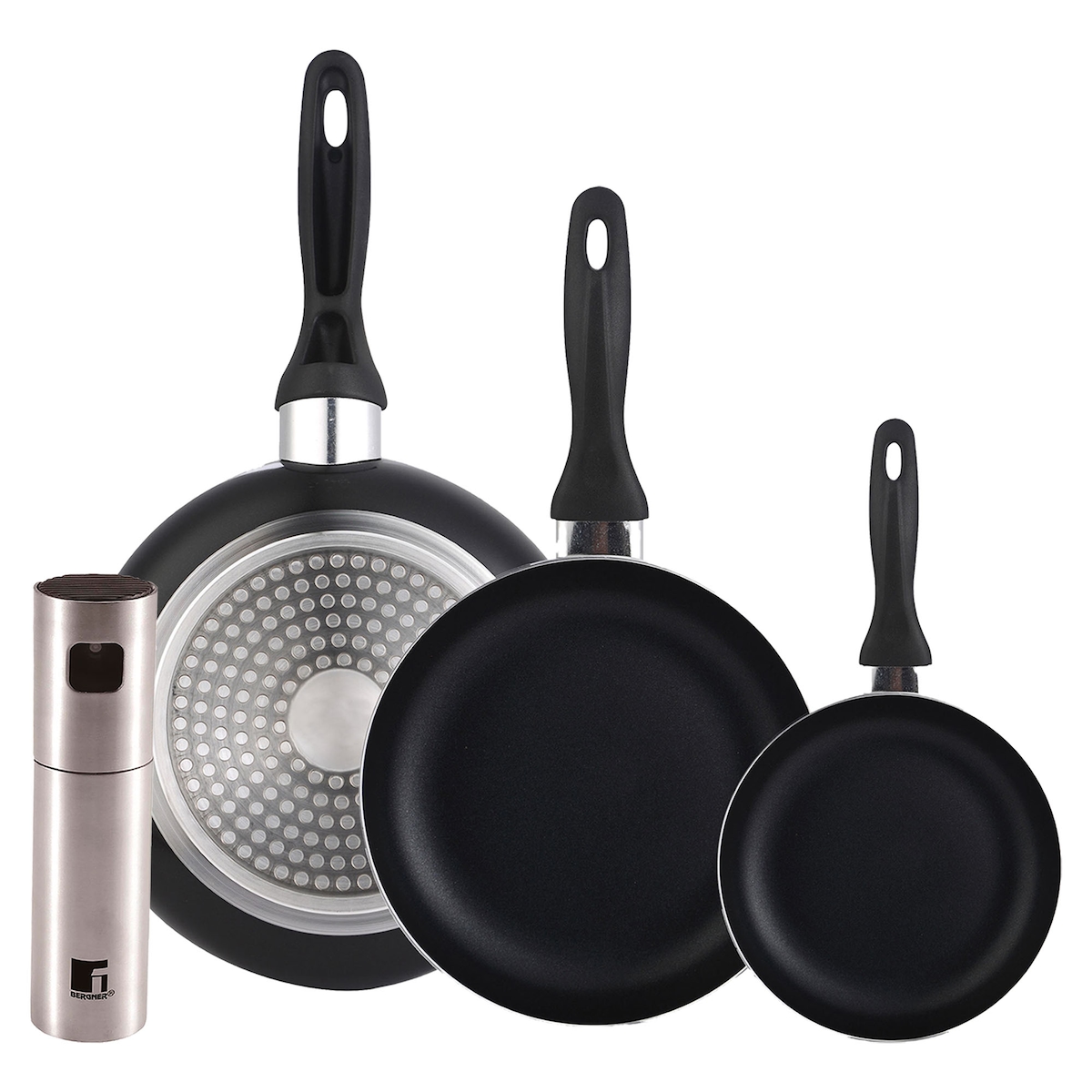 BERGNER - Set aus 3 Pfannen Ø16/20/24cm aus gepresstem Aluminium in schwarz mit Öl-/Essigsprüher Ø4x17,5 cm aus Edelstahl