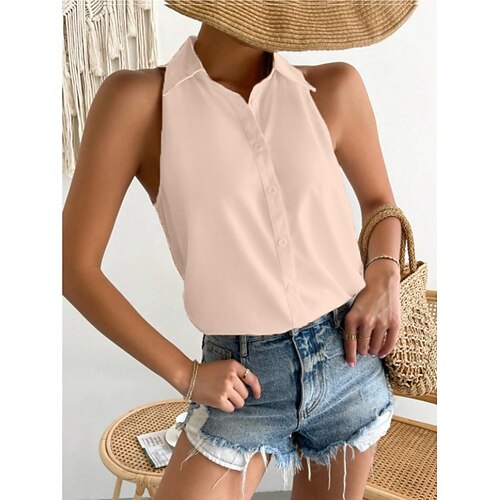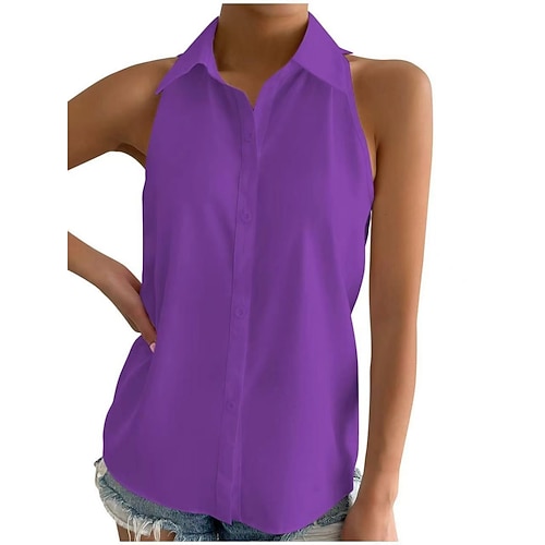 Per donna Camicia in raso Camicia con collo camp Arricciato Tinta unica Elegante Casual Senza Maniche Colletto a Camicia Top Regolari Quotidiano Nero Bianco Viola Arancione Verde Estate Primavera