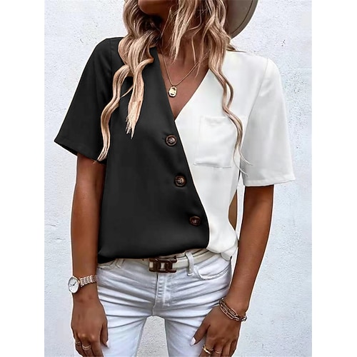 Per donna Camicia popover Camicia Estiva Camicia casual Blusa Patchwork Bottoni Tinta unica Vacanza Elegante Casual Manica Corta Scollo a V Top Regolari Quotidiano Spiaggia Ferie Nero Giallo Cachi