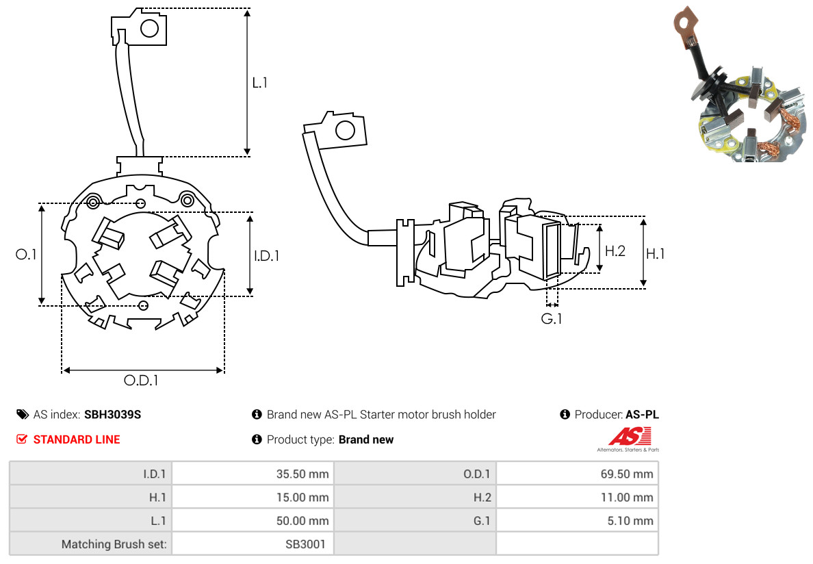 AS-PL Halter, Kohlebürsten SBH3039S Universal 69,50mm für HYUNDAI (BEIJING) 36170-2B100 36170-03100 36170-03200