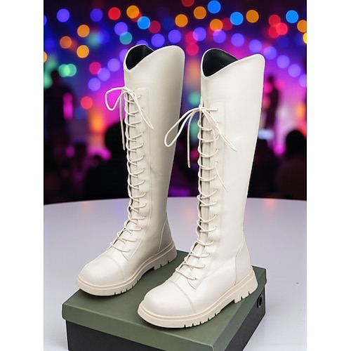 Scarpe da costume da pop star ispirate agli idoli coreani, stivali alti fino al ginocchio con lacci bianchi da bambina, con suola spessa, calzature alla moda per spettacoli di danza e abiti da