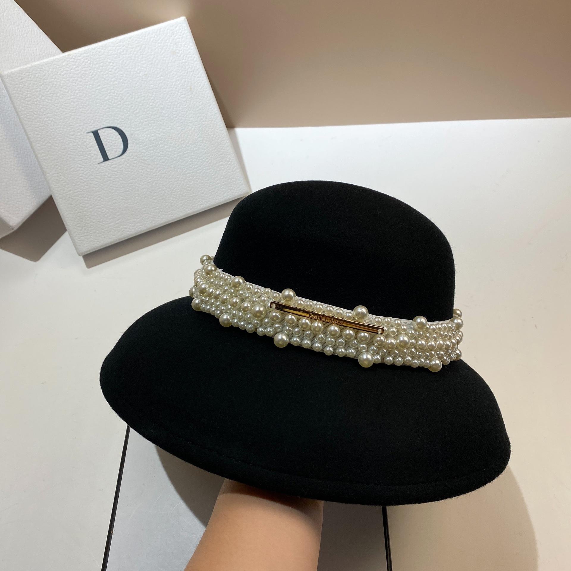 New Hepburn Style Wool Lampshade Hat Female Fashion European And American Socialite Xiaoxiangfeng Pearl Top Hat Heavy Industry Light Luxury cm black