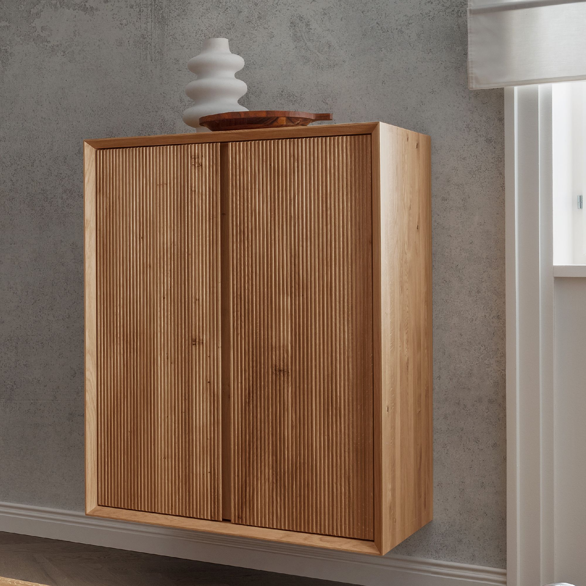 Niedrige Kommode in Weiß und Wildeiche Griffmulden