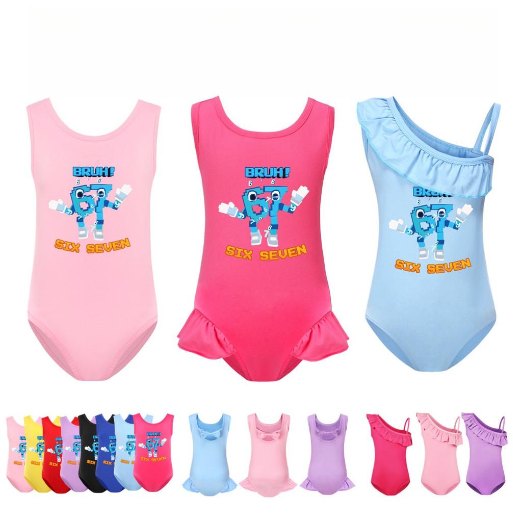 5223 Kids Girls Steal a Brainrot 67 Six Seven Print Ruffle Swimsuit Swimming One-piece Bodysuit Swimwear 150cm