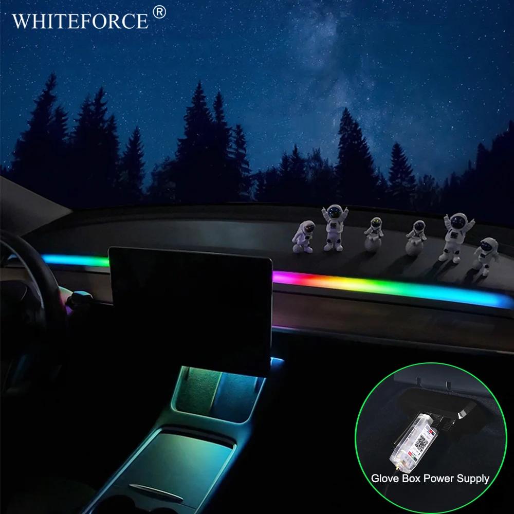 Für Tesla Model 3/Y 2017-2023 Streaming Ambientebeleuchtung Armaturenbrett Flow Light Fernbedienung/APP-Steuerung USB Ambiente-Streifenlampe Dekoratio