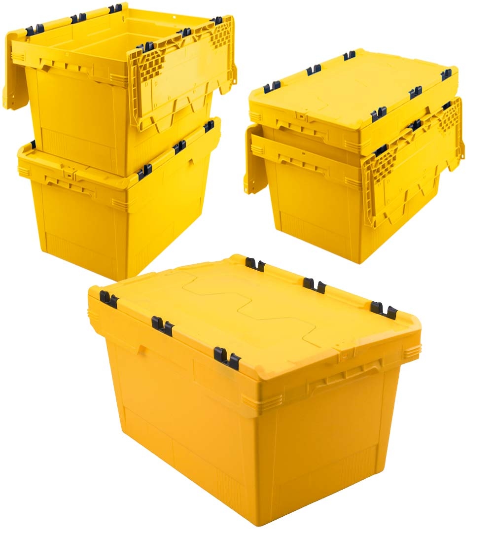 BRB Set, 5x Mehrwegbehälter mit Klappdeckel, gelb, verplompbar, LxBxH 600 x 400 x 350 mm, 58 Liter