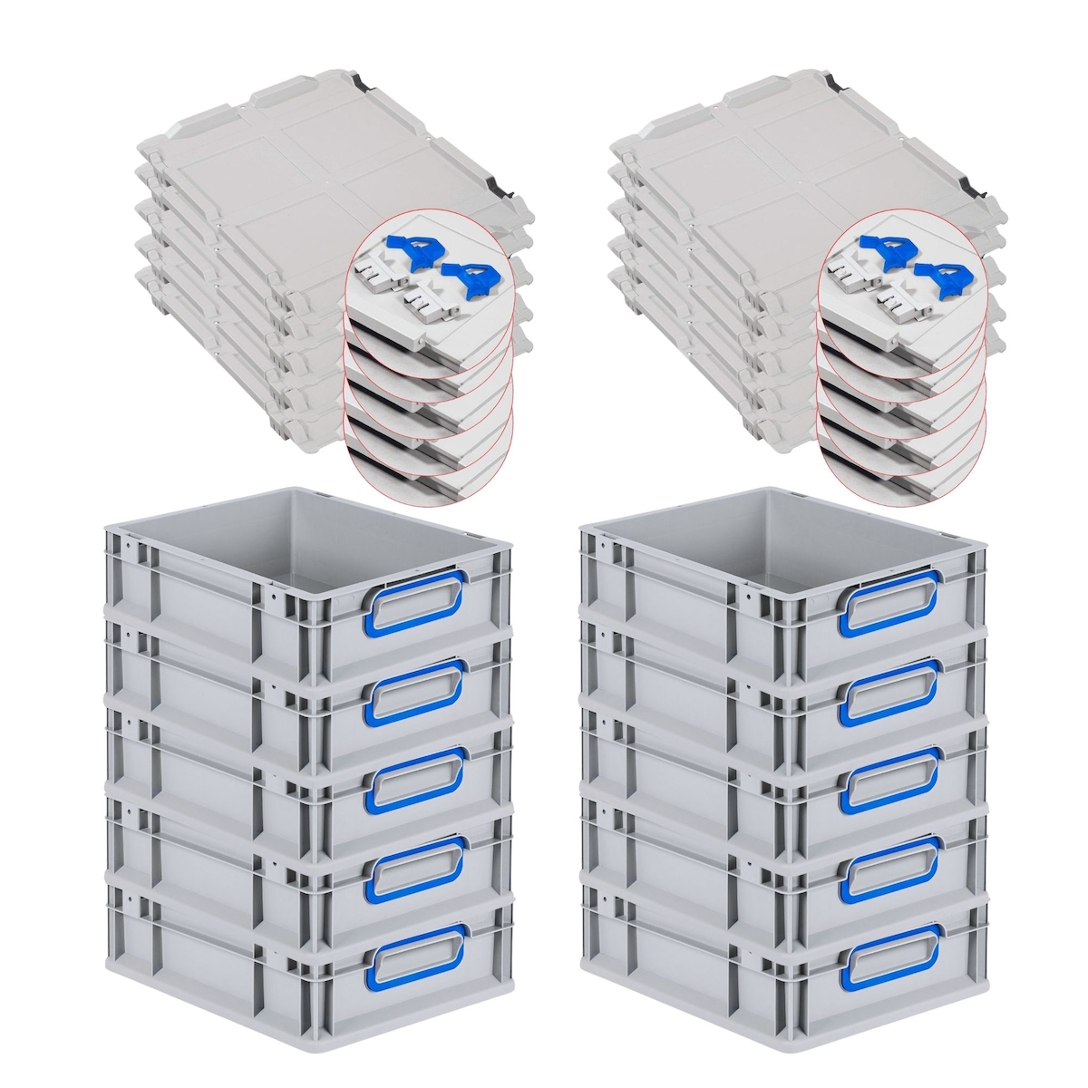 PROREGAL 10x Eurobox NextGen Color mit Scharnierdeckel & Verschlüssen | HxBxT 12x30x40cm | 11 Liter | Griffe blau geschlossen | Glatter Boden