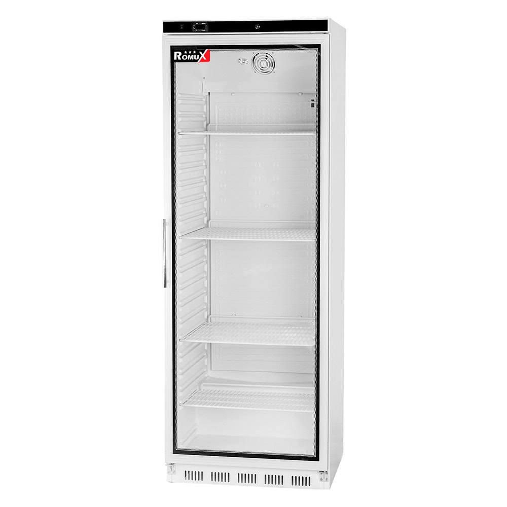 Romux® Kühlschrank ABS 400 Liter mit 1 Tür Glastür 60 cm mit Umluftkühlung weiß | Gastro Kühlschrank mit 400 L Kapazität - 4 Einlegeböden und 180 W