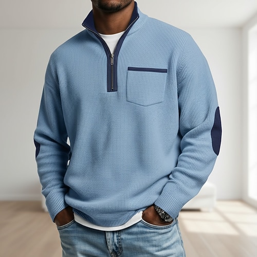 Per uomo Maglietta Waffle Maglietta Maglia Henley a nido d'ape Camicie da uomo con toppe sui gomiti Manica Lunga Collo Alto Mezza zip Autunno Inverno Tinta unica Patchwork Tradizionale / Vintage