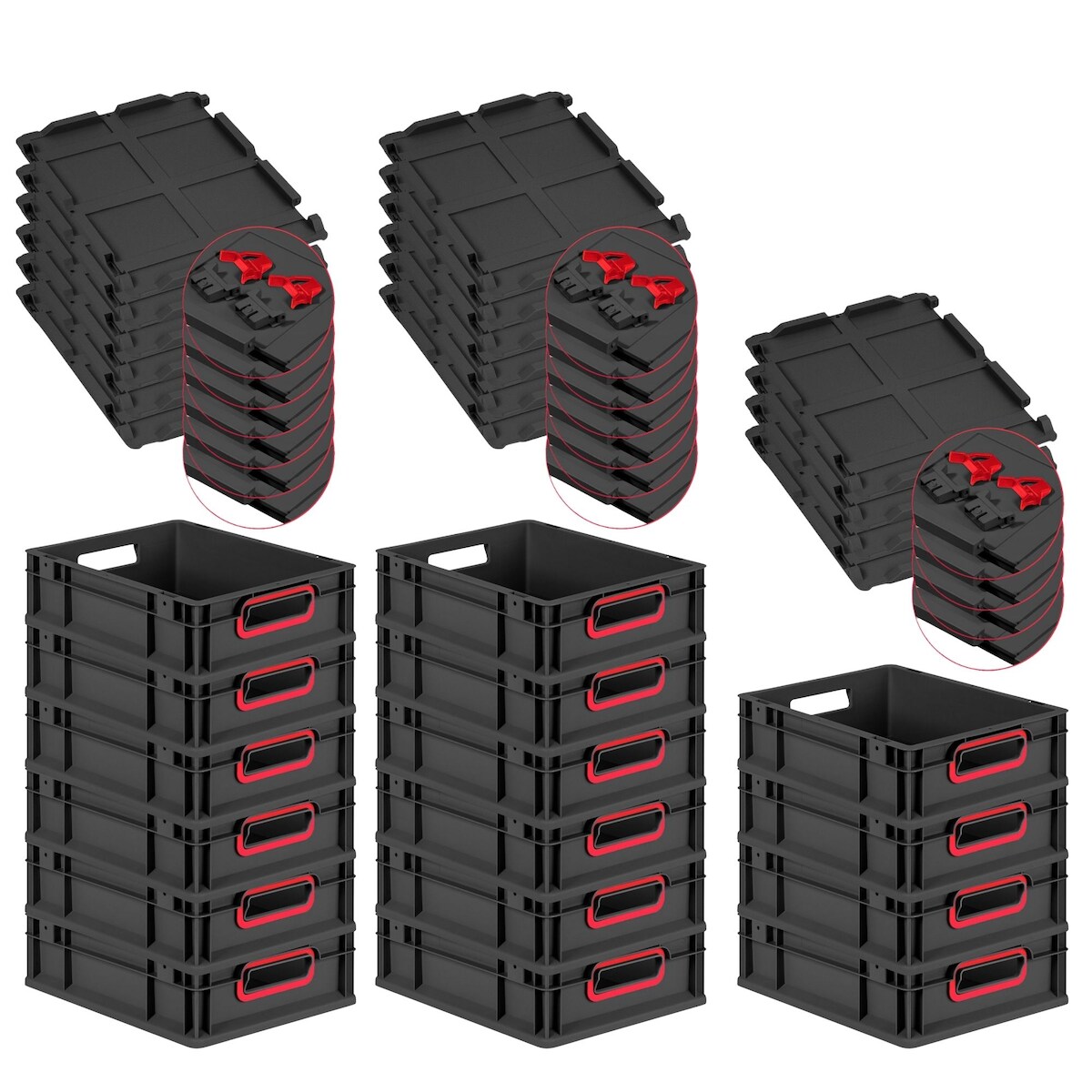 PROREGAL SuperSparSet 16x Eurobox NextGen Color mit Scharnierdeckel & Verschlüssen, HxBxT 12x30x40cm, 11L, Schwarz, Griffe rot offen, Eurobehälter