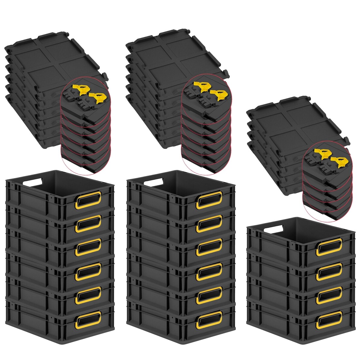PROREGAL SuperSparSet 16x Eurobox NextGen Grip mit Scharnierdeckel & gelben Verschlüssen, HxBxT 12x30x40cm, 11L, Schwarz, Griffe zu, Eurobehälter
