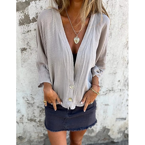 Per donna Camicia di lino Tinta unica Elegante Bohemien Vintage Manica Lunga Scollo a V Top Regolari Quotidiano Ferie Bottoni Verde pavone Nero Giallo Grigio scuro Albicocca Estate Primavera Autunno