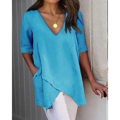 Per donna Camicie di cotone e lino Blusa Semplice Vintage Elegante Casual Mezza Manica Scollo a V Top Regolari Quotidiano Ferie Uscire Patchwork Asimmetrico Blu Giallo Arancione Verde Grigio Estate