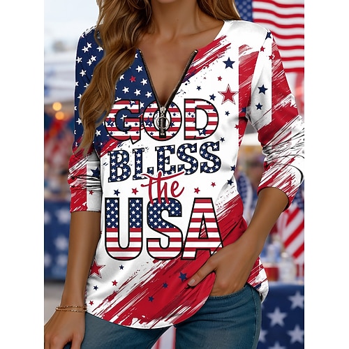 Giorno dell'Indipendenza Americana Per donna Maglietta Grafico Bandiera Americana Vintage Moda Elegante Manica Lunga Girocollo Top Regolari Quotidiano Cerniera Stampato Blu Bianco Rosso Estate