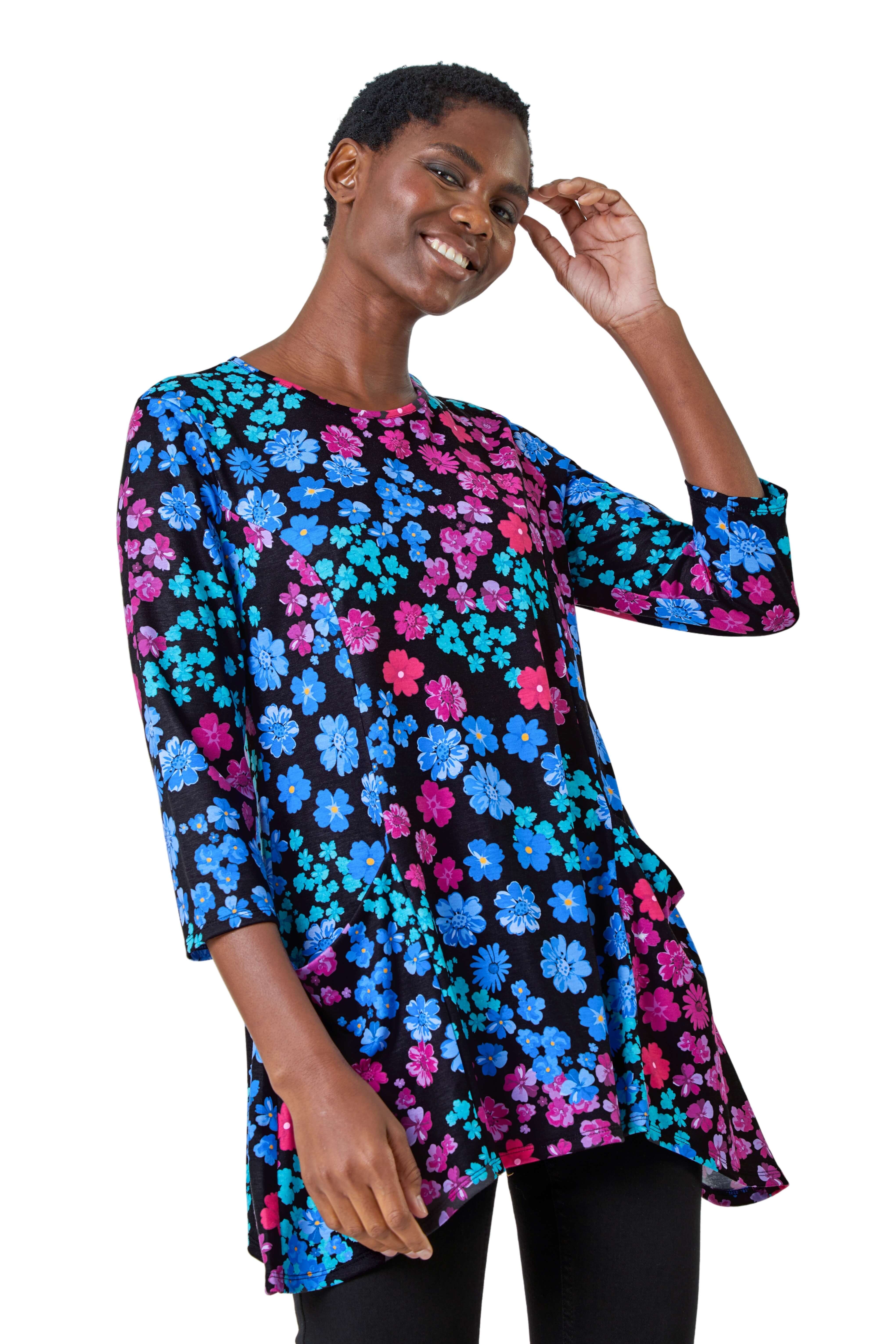 Roman Womens Floral Pocket Stretch Tunic Top - Blue - Size 12 UK | Roman Sale | Discount Designer Brands