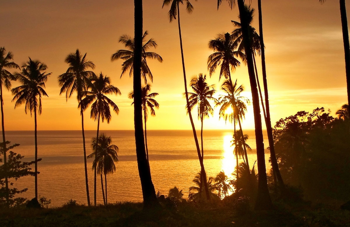 Fototapete PAPERMOON "PALMEN-STRAND-SONNENUNTERGANG KARIBIK SÜDSEE MEER SONNE", bunt, B:4,50m L:2,80m, Vlies, Tapeten