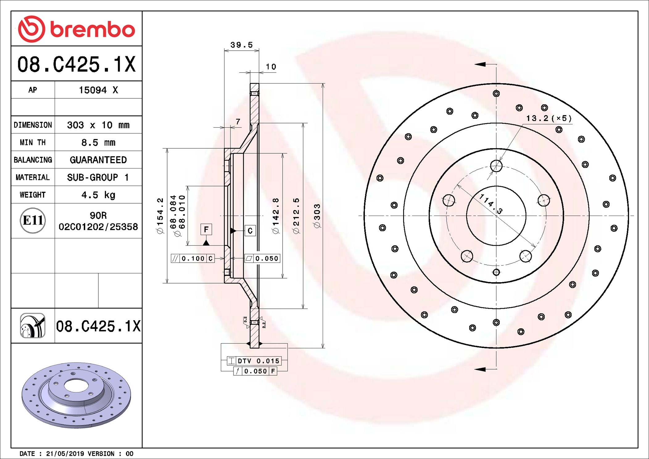 BREMBO XTRA LINE 08.C425.1X Bremsscheibe hinten rechts links Gelocht 303mm für HONGQI MAZDA (CHANGAN) KD5H26251 K01126251C K01126251A