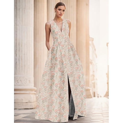 Linea ad A Lunghezza al pavimento Abito da Sera Da principessa Abito formale Elegante Vintage Senza Maniche Scollo a V Matrimonio Formale Nylon con Spacco Tasca