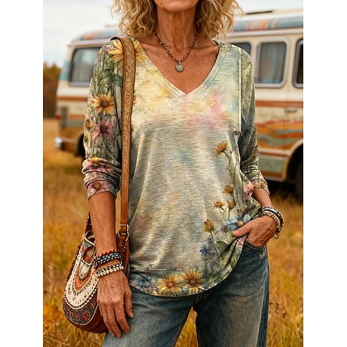 Per donna Maglietta Floreale Grafico Vintage Elegante Casual Manica Lunga Scollo a V Top Regolari Quotidiano Stampato Blu Rosa Viola Bianco sporco Primavera Autunno
