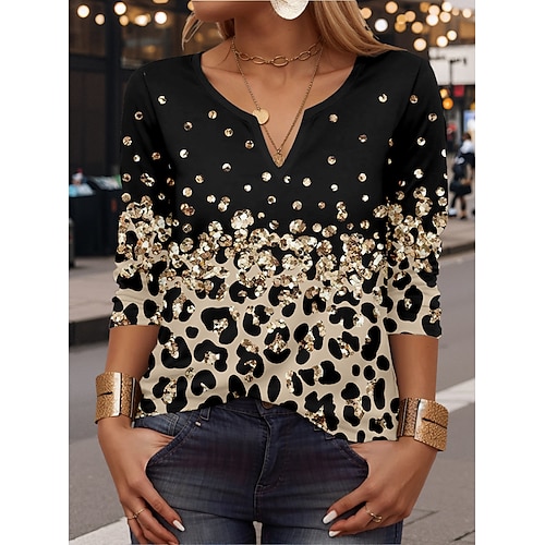 Per donna Maglietta Leopardo Casual Manica Lunga Collo a V Top Regolari Quotidiano Stampato Oro Primavera Autunno