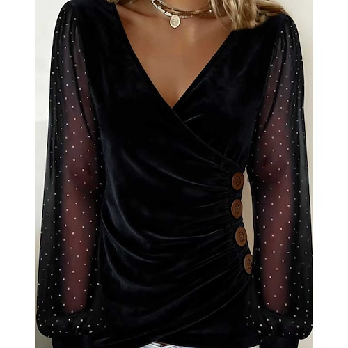 Per donna Velluto Blusa Tinta unica Elegante Manica Lunga Scollo a V Top Regolari Quotidiano Ferie Uscire Arricciato Patchwork Bottoni Nero Vino Verde smeraldo Oro Estate Primavera