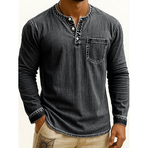 Per uomo Maglia Henley Maglietta Camicia vintage Manica Lunga Tinta unica Semplice Tinta unita Vintage Moda Retrò Bottoni Henley All'aperto Casuale Quotidiano Estate Primavera Tutte le stagioni Nero