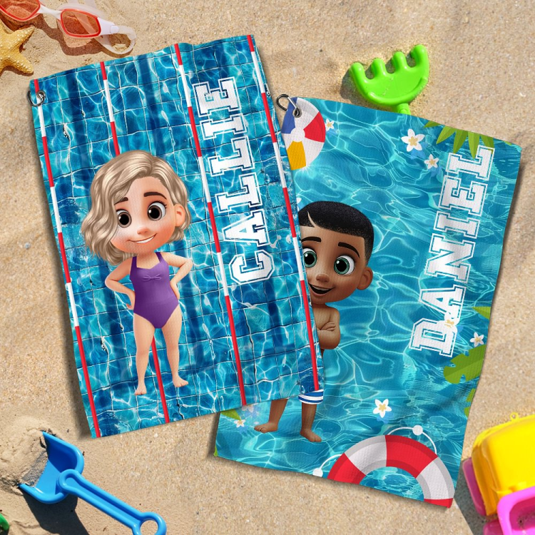 Personalizzato 3D Personaggio dei cartoni animati Piscina Morbido Asciugamano sportivo con nome e clip da appendere Accessori sportivi Regalo di compleanno per bambini Ragazze