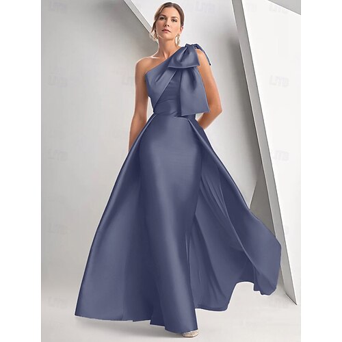 Abito da Sera A-Line Vestito Elegante Matrimonio Formale Lunghezza Pavimento Senza Maniche Una Spalla Matrimonio Satin con Fiocco/i