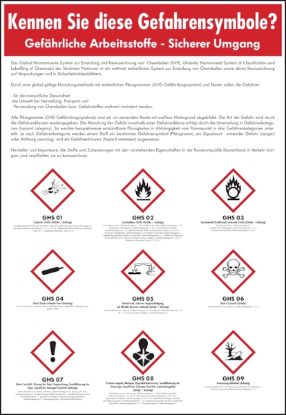 Aushang, Gefährliche Arbeitsstoffe - Sicherer Umgang - GHS Symbole - 410x595x1.5 mm Kunststoff