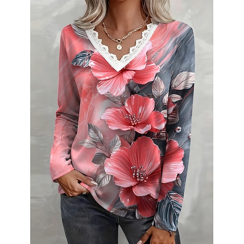 Per donna Maglietta Floreale Grafico Vintage Elegante Casual Manica Lunga Scollo a V Top Regolari Quotidiano Weekend Pizzo Stampato Blu Rosa Viola Primavera Inverno