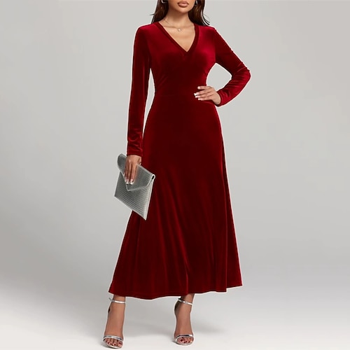 Per donna Abito Midi Abito in Velluto Abito da Cocktail Elegante Moda Moderno Quotidiano All'aperto Festa serale Vestibilità regolare Semplice Manica Lunga Scollo a V Blu Nero Vino Viola Primavera