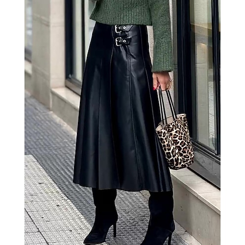 Per donna Gonna Linea A Elegante Moda Midi Vita media Gonne Semplice Arricciato Micro-elastico Streetwear Quotidiano Nero Autunno Finta pelle Poliestere