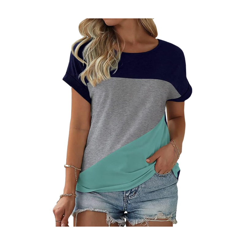 Women's Color Block Short Sleeve Tops Casual Summer T-Shirt (blue, L)