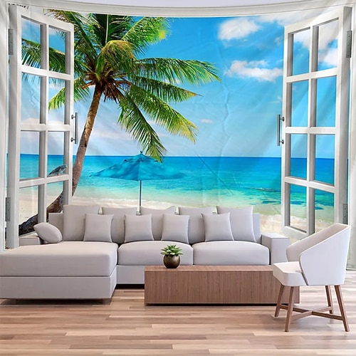 Arazzo da parete con vista della finestra in 3D, paesaggio tropicale, spiaggia, oceano, palma, finestra finta, decorazione da parete per soggiorno, camera da letto, murale