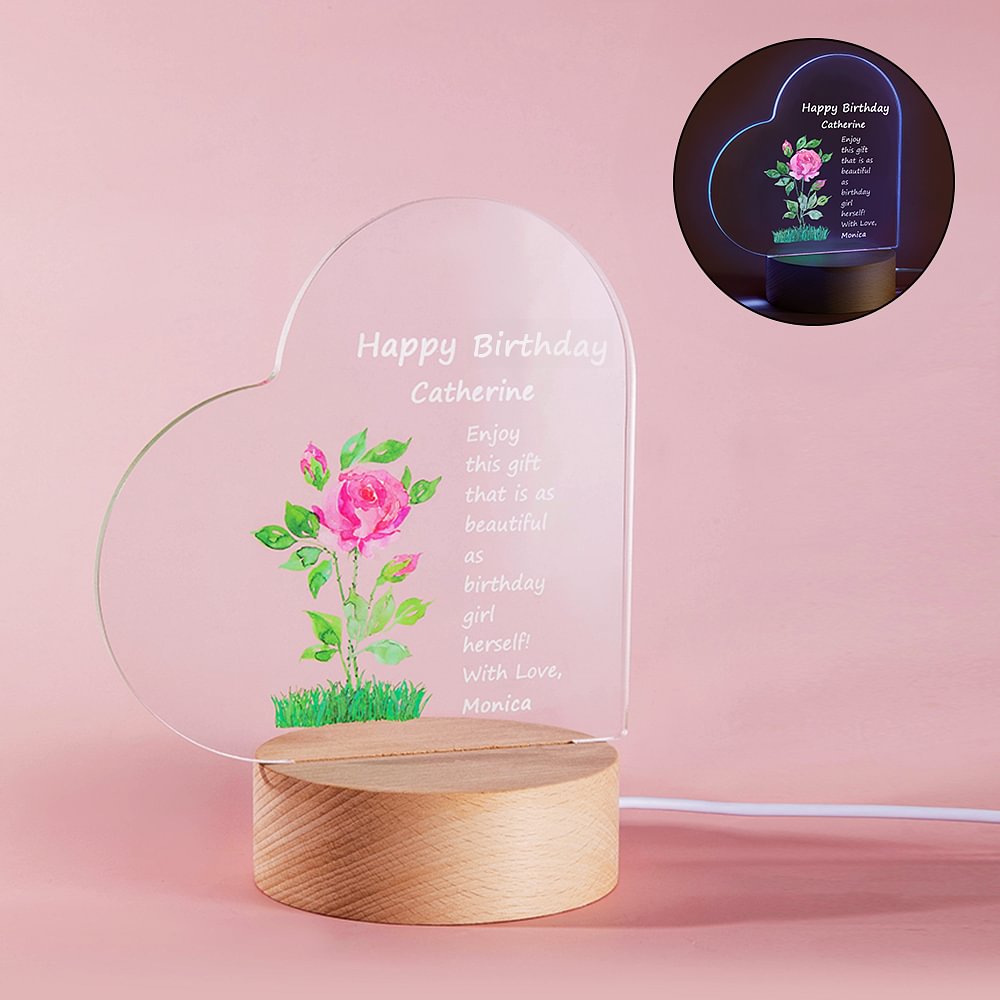Gepersonaliseerd Geboortebloem Verstelbaar LED Nachtlampje met Houten Voet en Hart Acryl Plaquette en Namen Kamer Decoratie Verjaardagscadeau voor Kin