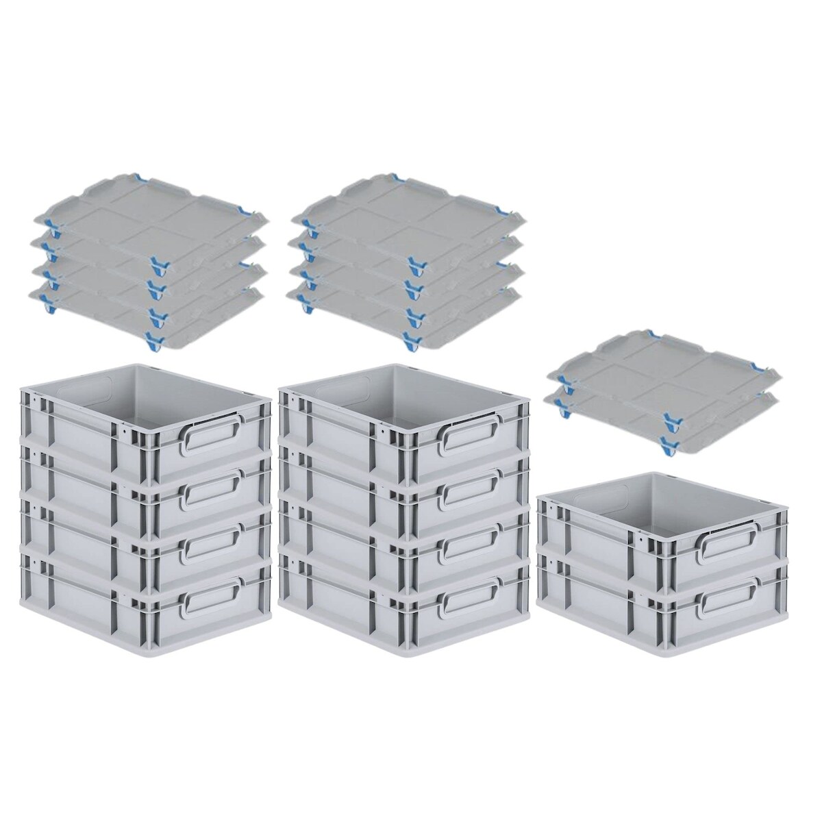 PROREGAL SuperSparSet 16x Eurobox NextGen Color mit Auflagedeckel & Verschlüsse, HxBxT 12x30x40cm, 11L, Schwarz, Griffe blau zu, Eurobehälter