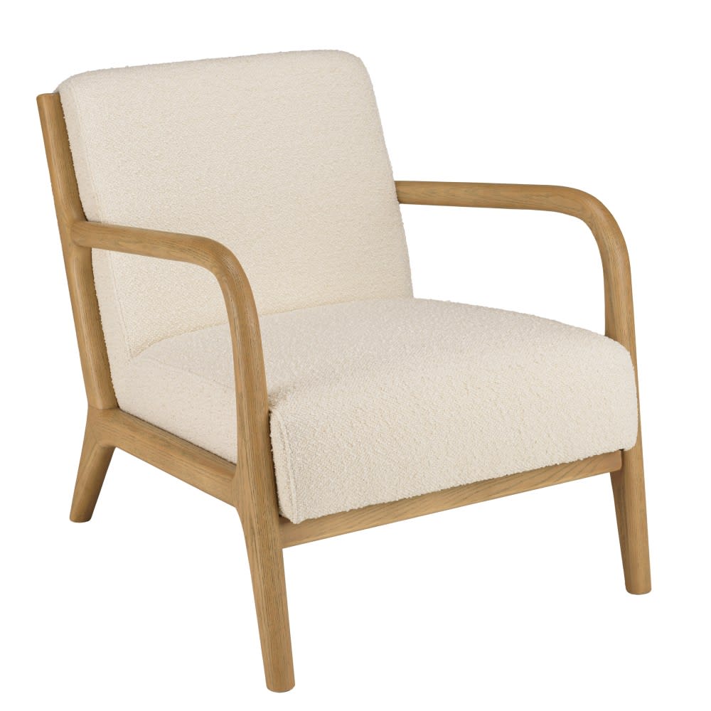 Fauteuil bas tissu bouclette écru structure et accoudoirs bois