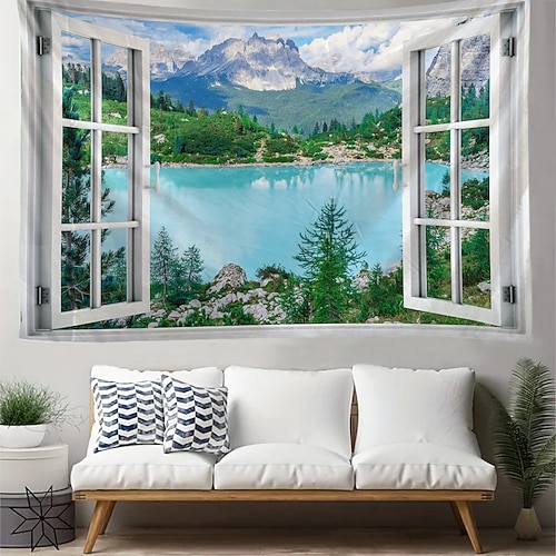 Arazzo con paesaggio naturale, finta finestra con vista lago di montagna, arazzo da parete, effetto visivo 3D, sfondo per soggiorno, camera da letto, arredamento per la casa