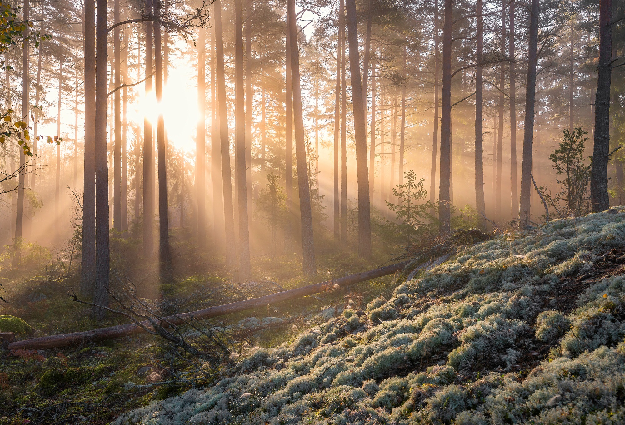 Fototapete PAPERMOON "CHRISTIAN LINDSTEN, NEBEL IM WALD MIT WEIßEM MOOS IM UNTERGRUND", bunt, B:4,50m L:2,80m, Vlies, Tapeten
