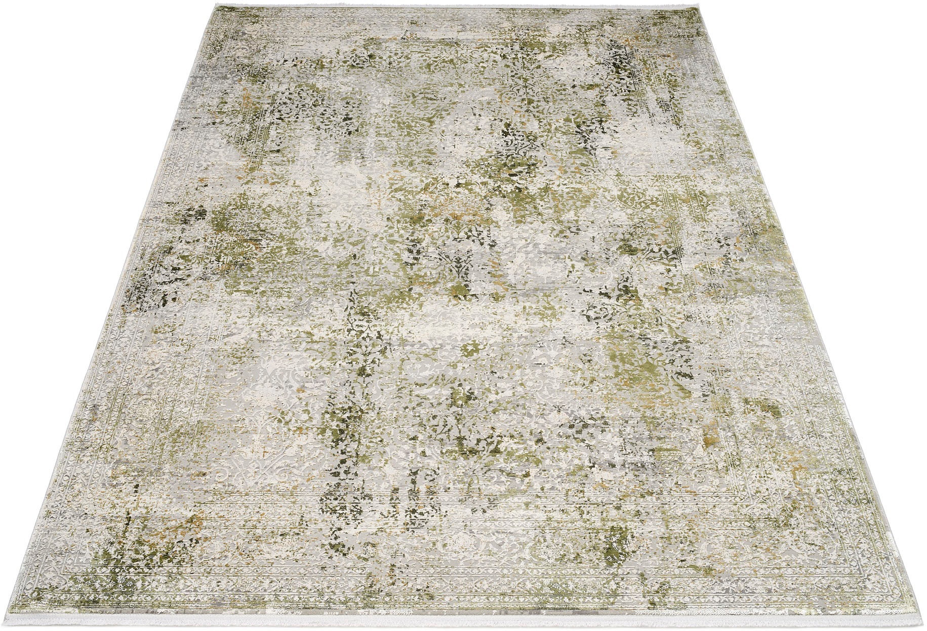 Teppich OCI DIE TEPPICHMARKE "BESTSELLER CAVA", grün (grün, grau), B:240cm H:8mm L:240cm, Kunstfaser, Viskose, Teppiche, Fransenteppich, Glanz Viskose, mit Fransen, Hoch Tief Struktur, Vintage, Wohnzimmer