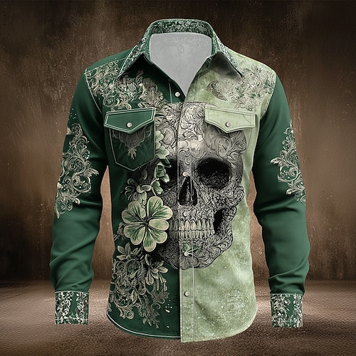 Camicia button-up da uomo con teschio paisley e quadrifoglio per il giorno di San Patrizio maniche lunghe vintage retro festa vacanza primavera autunno colletto stampa in 3D due tasche frontali