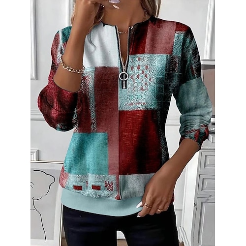 Per donna Felpa Pullover Felpe con cerniera Grafico Geometrico Blocco di colori Moda Casual Manica Lunga Girocollo Top Regolari Streetwear Abbigliamento Quotidiano Patchwork Cerniera Stampato Blu
