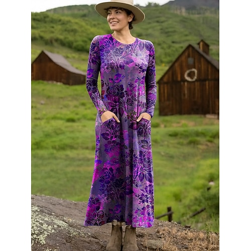 Per donna Abito maxi Tubino Vestito T-Shirt Vacanza Casual Quotidiano Uscire Vestibilità comoda Floreale Grafico Manica Lunga Girocollo Blu Rosso Viola Verde Primavera Autunno Inverno