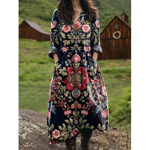 Per donna Abito maxi Vestito Estivo Abito a trapezio Vacanza Casual Boho Compleanno Quotidiano Ferie Vestibilità comoda Floreale Grafico Geometrico Manica Lunga Scollo a V Nero Blu Arancione