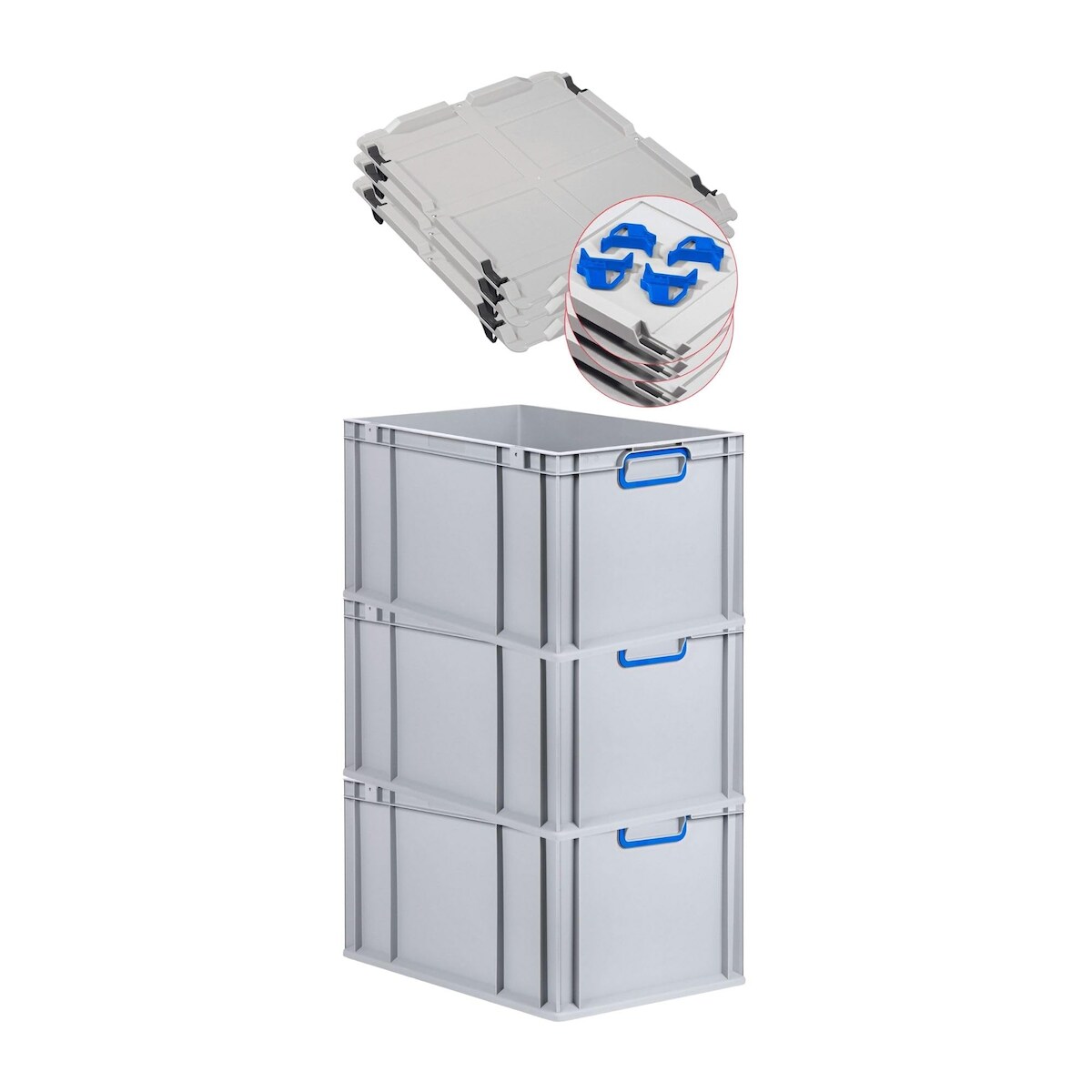 PROREGAL SuperSparSet 3x Eurobox NextGen Color mit Auflagedeckel & Verschlüsse, HxBxT 32x40x60cm, 65L, Grau, Griffe blau zu, Eurobehälter, Box