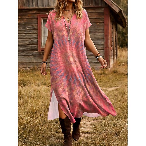 Per donna Abito lungo Abito lungo Abito casual Abito a T shirt Abito estivo Moda Informale Da mare Giornaliero Standard Colorato a macchie Manica corta A V Rosa Blu Arancione Verde Estate